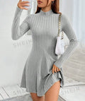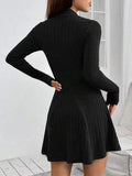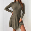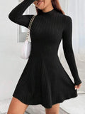 Elegant Slim Fit High Neck Dress – Long Sleeve A-Line Silhouette with Side Stripe Detail